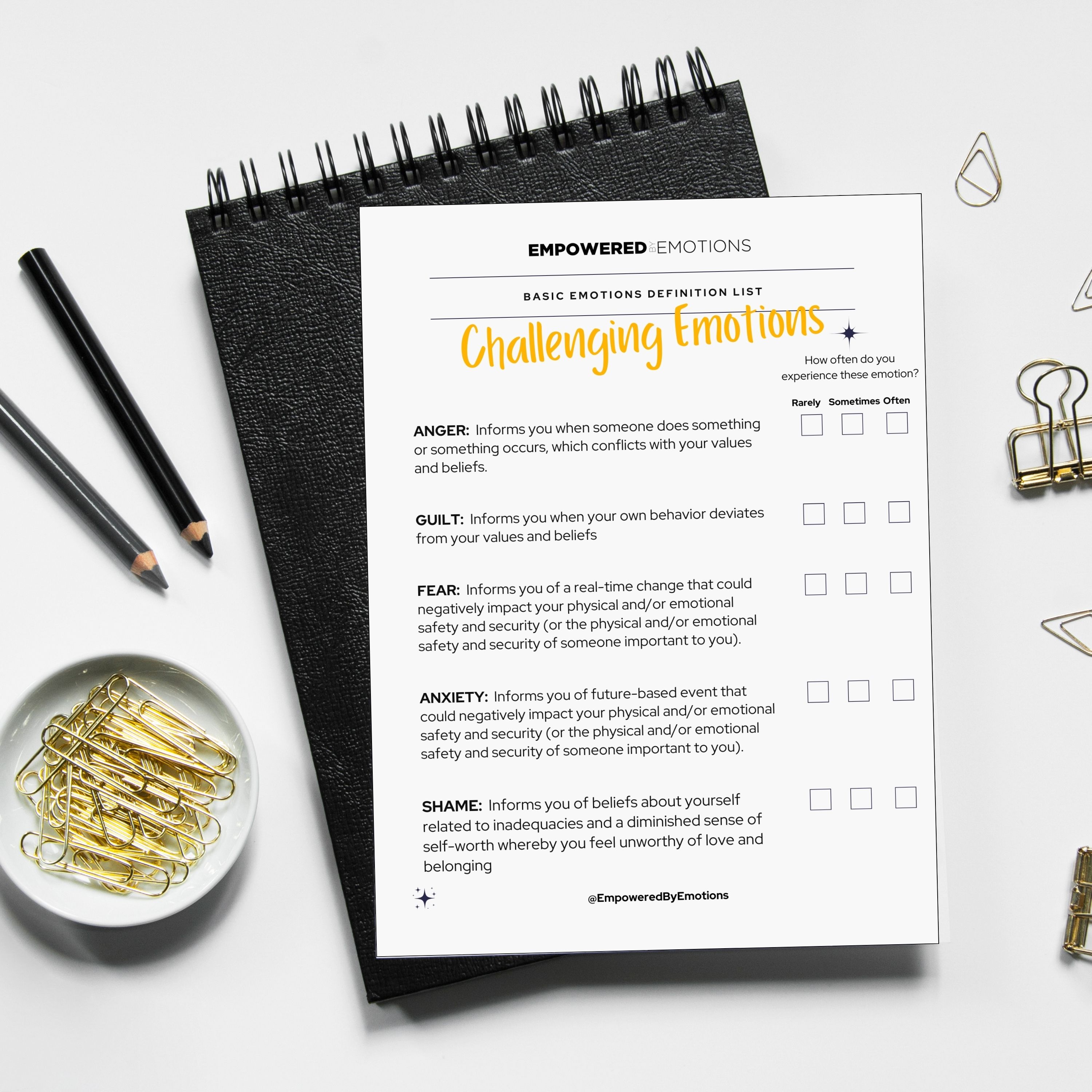 A one-page PDF that includes definitions for five common emotions; Anger, Guilt, Fear, Anxiety, and Shame.